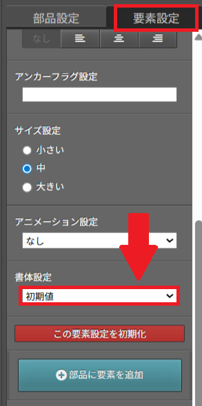 2)要素設定になっていることを確認し、書体設定にて変更します